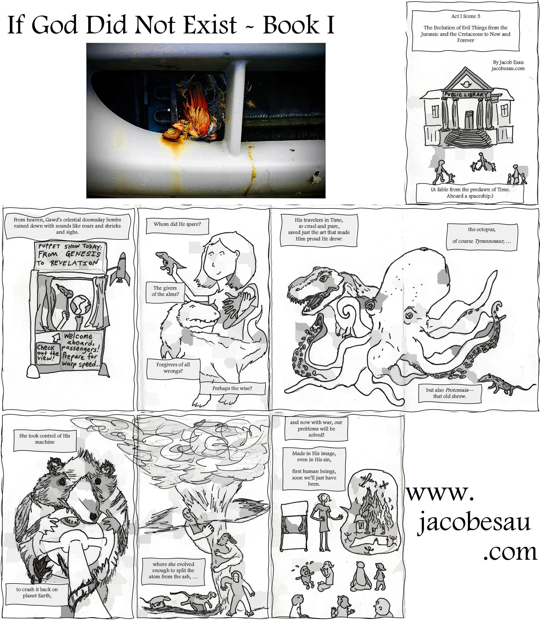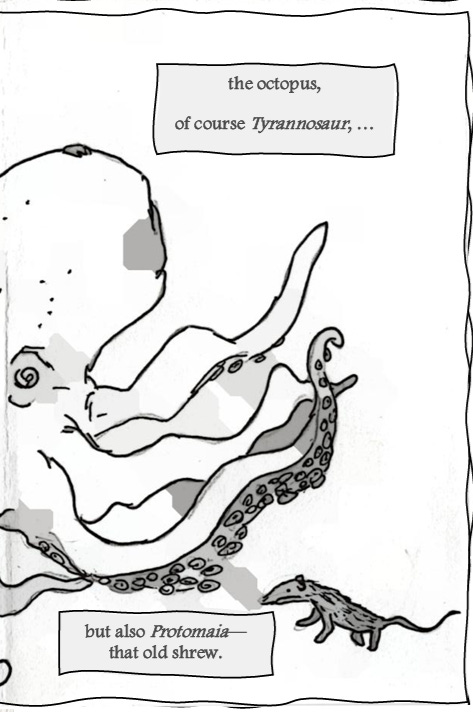 From heaven, Gawd’s celestial doomsday bombs rained down with sounds like roars and shrieks and sighs. Whom did He spare? The givers of the alms? Forgivers of all wrongs? Perhaps the wise? His travelers in Time (of this, we’re sure) saved all the art that made Him proud He drew: the octopus, of course Tyrannosaur, but also Protomaia—that old shrew. She took control of His machine to crash it back on planet Earth, where she evolved enough to split the atom from the ash, and now with war, our problems will be solved!