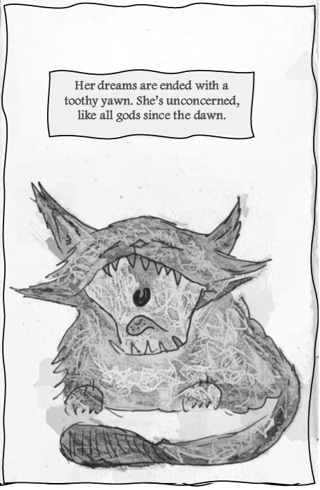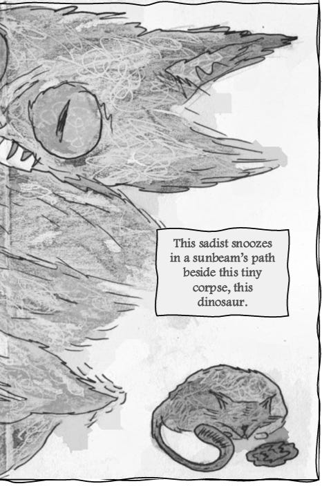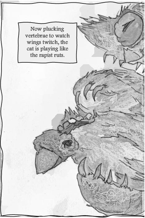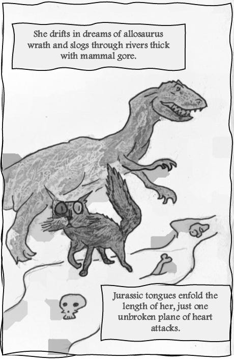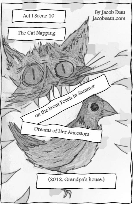 Jacob Esau is a writer of Syrian descent who’ll soon be accused of “INFILTRATING YOUR COMMUNITY” as he goes— (“Hey! Citizens! My family and I are citizens now! Hands off me, motherfu— Current papers? What do you mean? What—what papers? No, I don’t carry pr— Oof! You jackboot thugs! Did you seriously just kick me to the ground?! Hey. Look. Listen. I didn’t mean it. Why don’t we both just calm down here? Maybe you didn’t hear me? I’m a citiz— In where? That van? Yeah, okay, no. Now I know you’re joking. Where the hell do you think you’re gonna take us anyway! Hey. No. Don’t you dare point that gun at—”) —meandering between the middle and eastern regions of Tennessee, which are the two beautiful places he considers home. As a Mideast Tennessyrian, he envisions the coming day when he will be imprisoned in some unnamed totalitarian state while writing and illustrating a weekly comic strip. He will publish these comics on his jail cell walls with just an audience of fellow inmates and prison guards to guffaw at his life’s work, their barks of elation only drowned out by the cracks of rifle butts and night sticks against his skull. Until that torturous, fortuitous day comes to pass, he will begrudgingly settle for selling little dramatic scenes told in the form of comic sonnet zines, just like the one you are holding in your hands now. To read more and to offer your financial support for what may end up being his future legal defense fund (hahaha?), consider subscribing and sparing a dollar or two, won’t you?