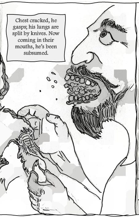 Jacob Esau is a writer of Syrian descent who’ll soon be accused of “INFILTRATING YOUR COMMUNITY” as he goes— (“Hey! Citizens! My family and I are citizens now! Hands off me, motherfu— Current papers? What do you mean? What—what papers? No, I don’t carry pr— Oof! You jackboot thugs! Did you seriously just kick me to the ground?! Hey. Look. Listen. I didn’t mean it. Why don’t we both just calm down here? Maybe you didn’t hear me? I’m a citiz— In where? That van? Yeah, okay, no. Now I know you’re joking. Where the hell do you think you’re gonna take us anyway! Hey. No. Don’t you dare point that gun at—”) —meandering between the middle and eastern regions of Tennessee, which are the two beautiful places he considers home. As a Mideast Tennessyrian, he envisions the coming day when he will be imprisoned in some unnamed totalitarian state while writing and illustrating a weekly comic strip. He will publish these comics on his jail cell walls with just an audience of fellow inmates and prison guards to guffaw at his life’s work, their barks of elation only drowned out by the cracks of rifle butts and night sticks against his skull. Until that torturous, fortuitous day comes to pass, he will begrudgingly settle for selling little dramatic scenes told in the form of comic sonnet zines, just like the one you are holding in your hands now. To read more and to offer your financial support for what may end up being his future legal defense fund (hahaha?), consider subscribing and sparing a dollar or two, won’t you?